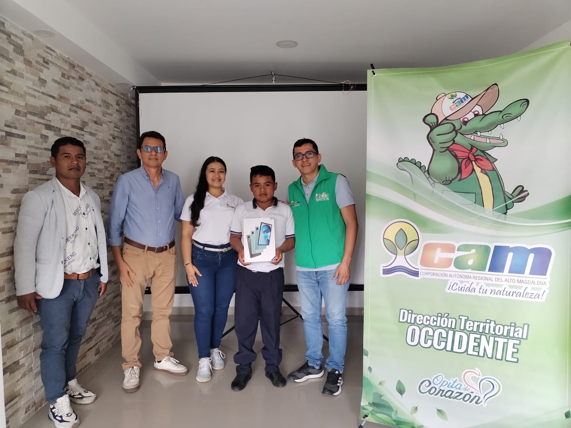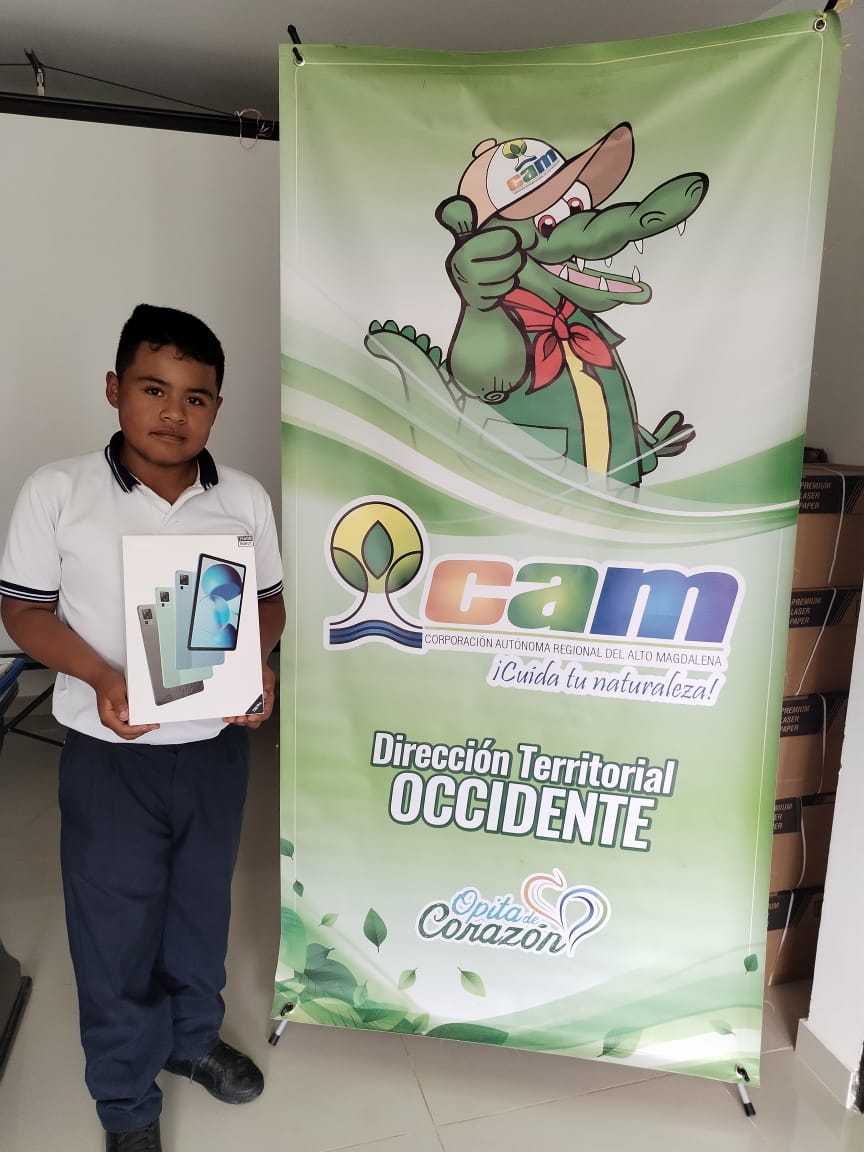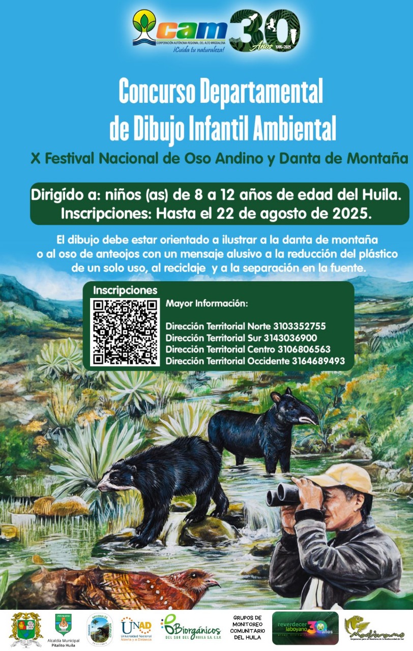 El estudiante Yener Arbey Chate fue ganador del Concurso Departamental de Dibujo Infantil Ambiental, organizado por la CAM en el marco del X Festival Nacional de Oso Andino y Danta de Montaña. Su obra promueve la conciencia ambiental y la reducción del uso de plásticos.